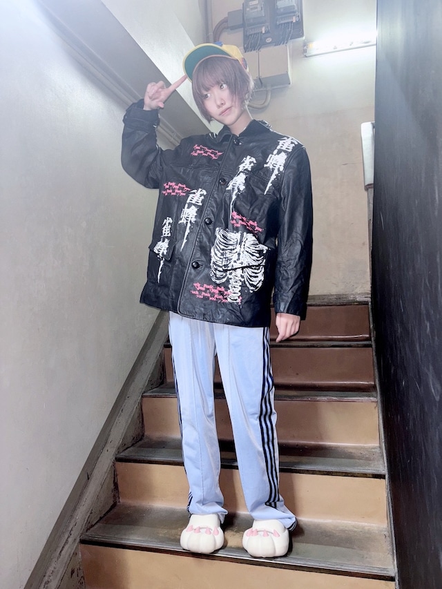 ※こちらは一点物のオリジナルリメイク商品です。 すべておみせでプリントしていますので、プリントのかすれ、ズレ等はあらかじめご了承くださいませ。 トップス モデル身長約170cm 着丈約70㎝ 身幅約58㎝ 肩幅約53㎝ 袖丈約54㎝ パンツ モデル身長152cm ウエスト約80〜100㎝ 股上約30㎝ 股下約64㎝ ワタリ約28㎝ 裾約25㎝ ▽ダメージ以外にも、全体に古着商品特有の使用感があります。実際と若干お色味が異なる場合があります、ご了承お願い致します。 ▽お客様のご都合によるキャンセル、返品、交換は固くお断りしております。