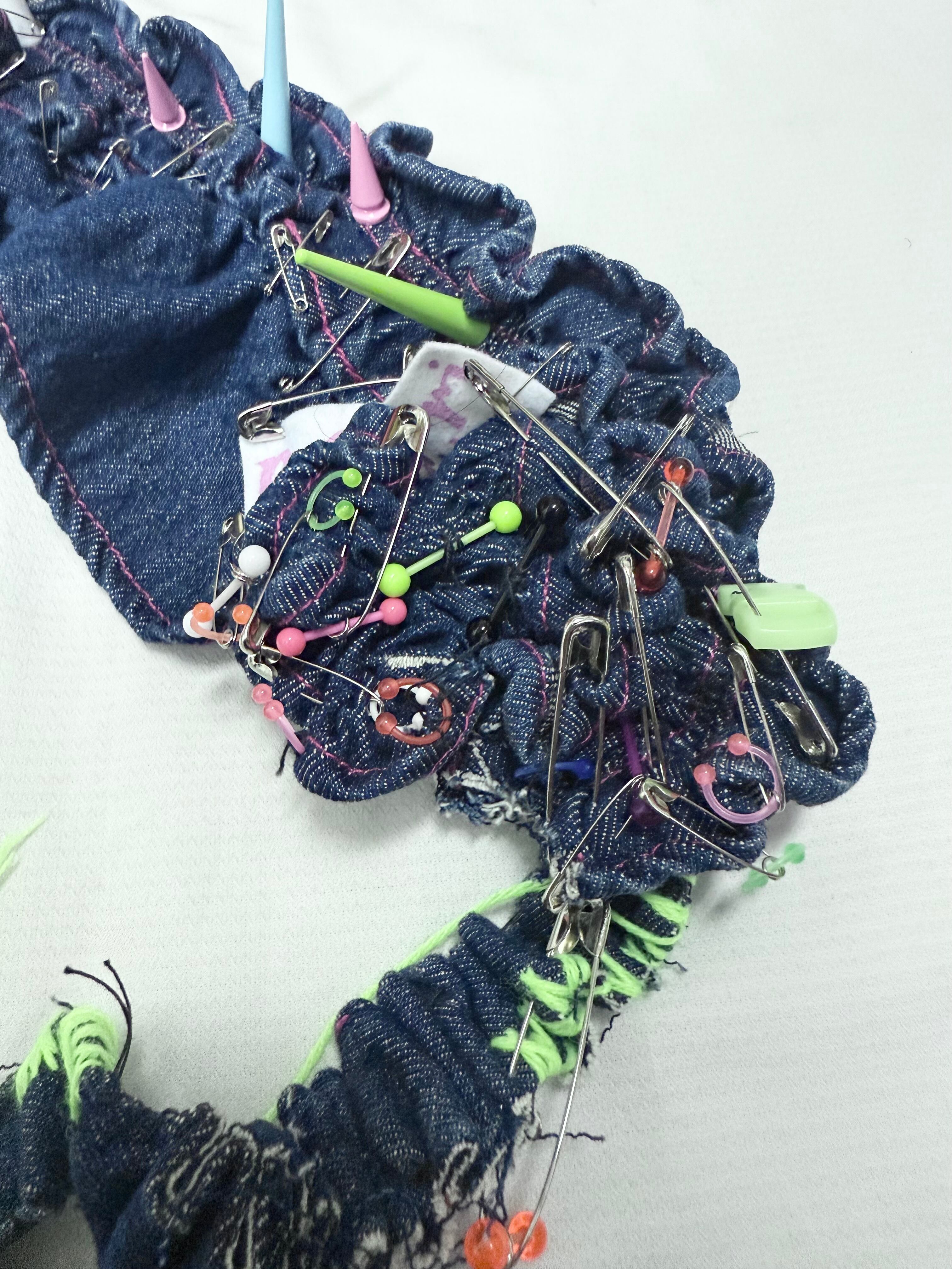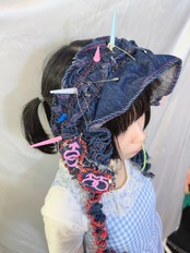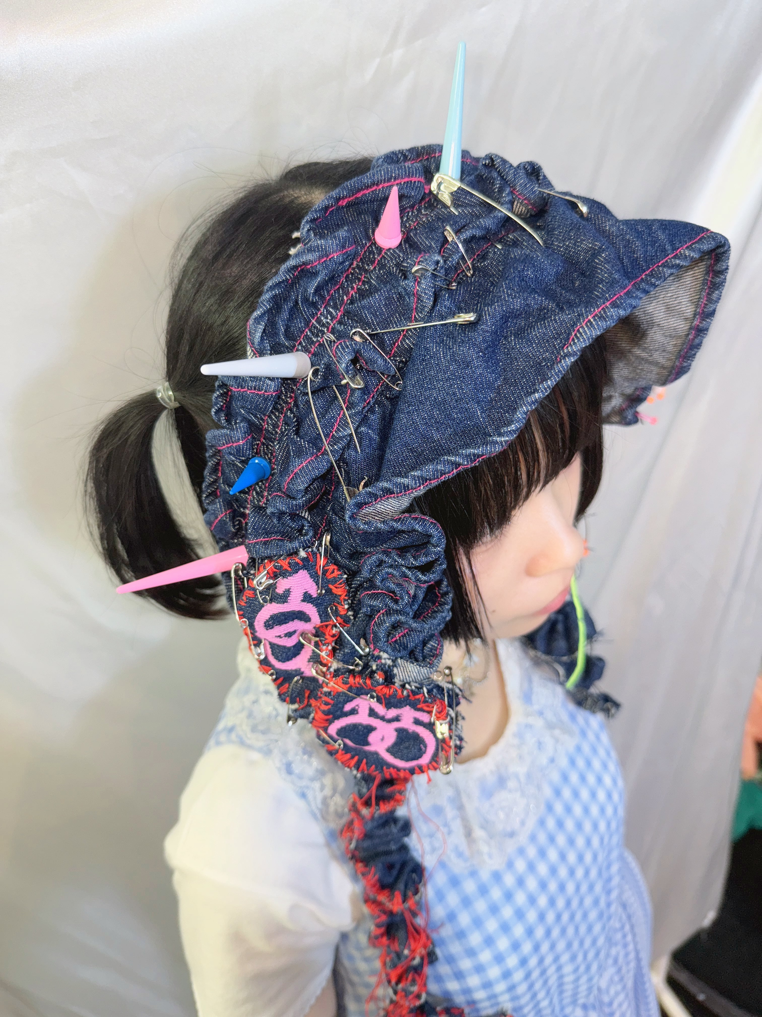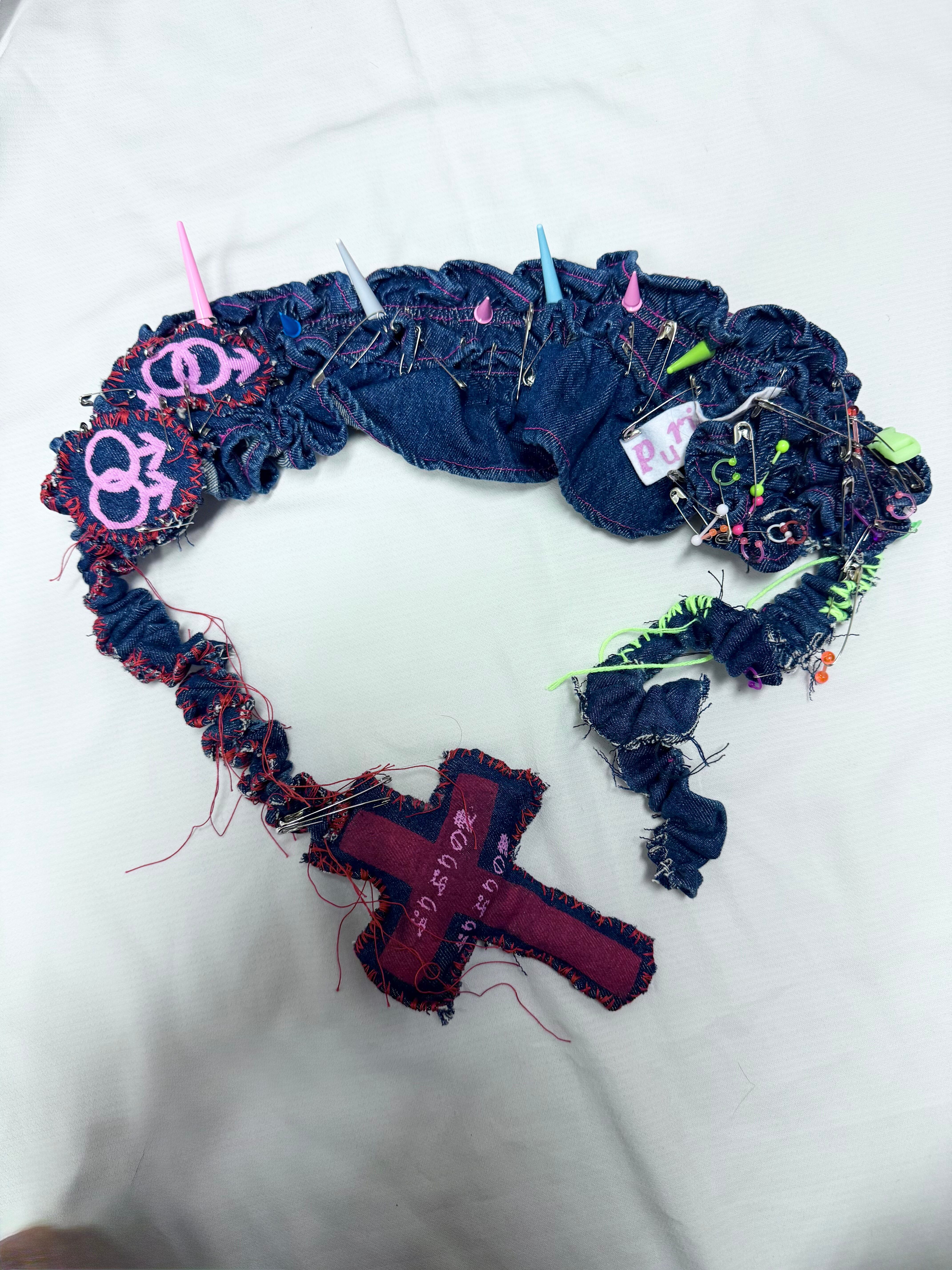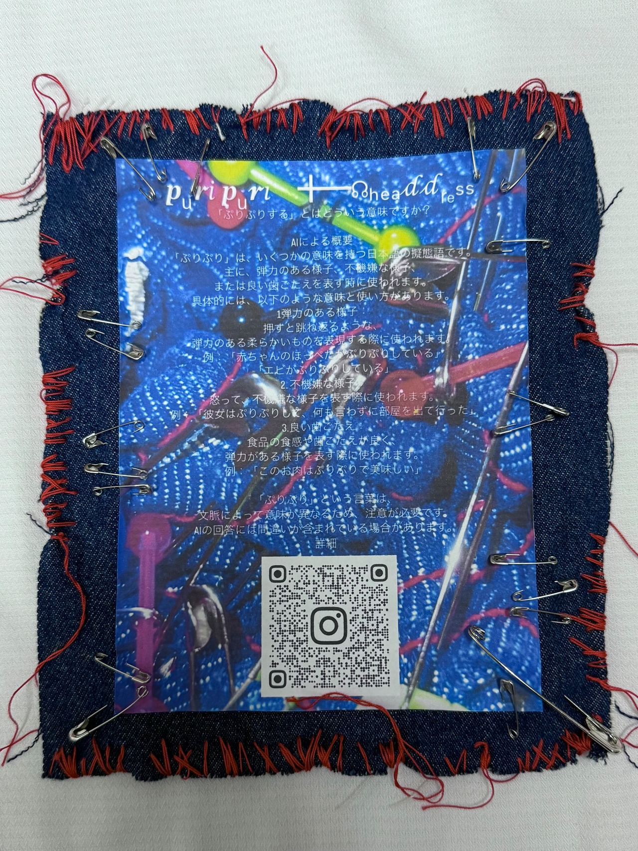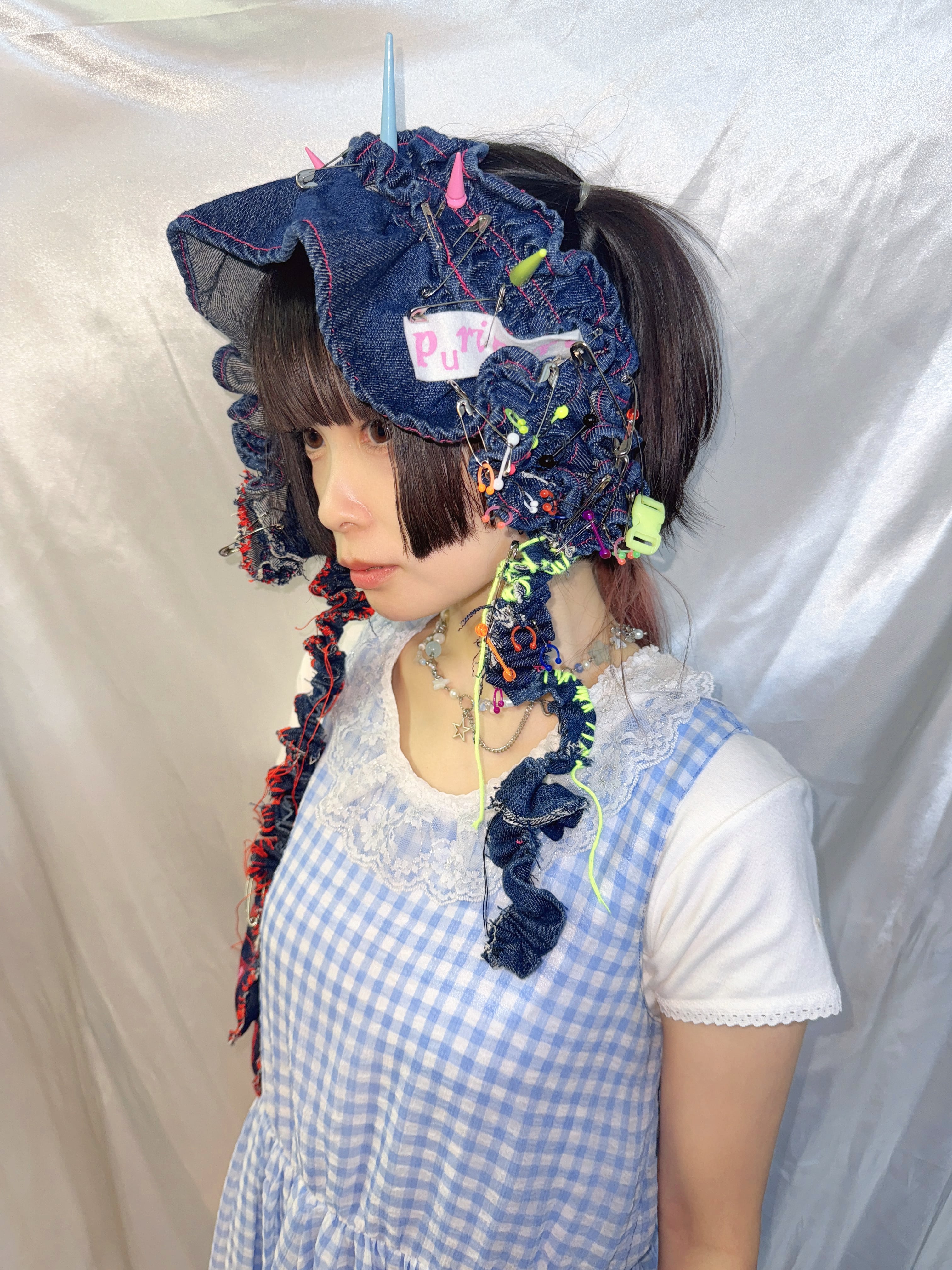 denim bagを解体し……AIによるぷりぷりの意味をつめこみ手縫いとシルクスクリーンを用いてhead dressに変身させました